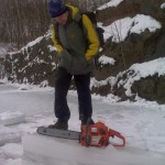 … am Samstag den 09.01.2010 mit dem Fichtenmopped Eis bearbeiten. :-) Es war nun 1 Woche schön kalt. Daisy fegt über Deutschland, aber der Steinbruch ist noch erreichbar. Das Eis trägt, wenn es auch unter meinem Gewicht ganz schön knarrt. Erstmal Schnee beiseite schieben und dann vorsichtig die Säge angeworfen und angesetzt. Hmmm fetzt, aber man(n) wird ziemlich naß, da die Kette ordentlich Wasser mit nach hinten schmeißt.